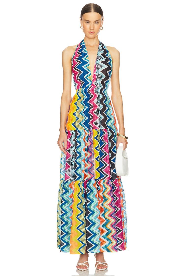Lightweight voile fabric and a vibrant chevron print create an effortlessly breezy maxi cover-up with a halter neck and tie-back closure. The flowy silhouette cascades in tiered layers, perfect for warm beach days or tropical vacations. Crafted from a cotton-silk blend, it offers breathable comfort with a casual chic bohemian vibe ideal for spring and summer outings. Versatile for beachwear, casual brunches, or relaxed travel, this long cover-up embodies easy elegance and colorful charm.