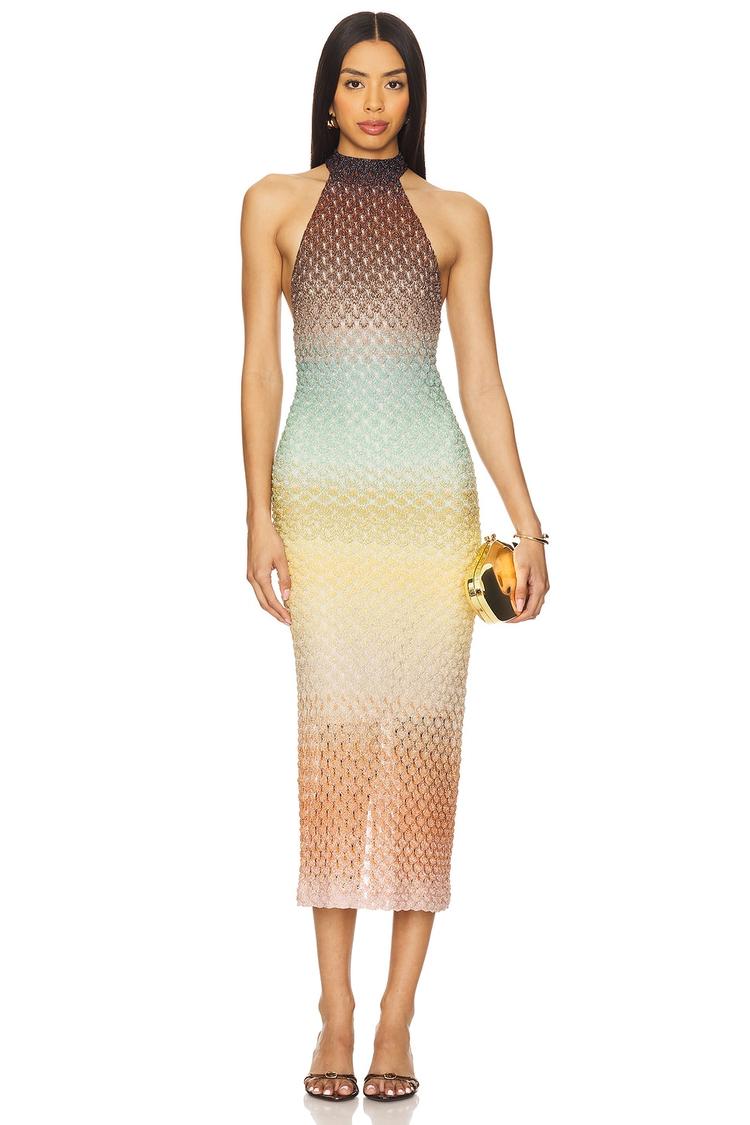 Metallic ombre hues blend seamlessly across a midweight crocheted column silhouette, creating a striking statement for spring to autumn evenings. The fitted midi length flatters with a halter neckline and open back, accentuated by a subtle back vent slit for ease and allure. Crafted from a luxe blend of viscose, lurex, polyester, and elastane, this elegant design offers both shimmer and stretch. Ideal for cocktail parties, date nights, and refined night outs, its hidden back zip and button closure ensure a sleek finish. A modern classic that dazzles with understated sophistication.