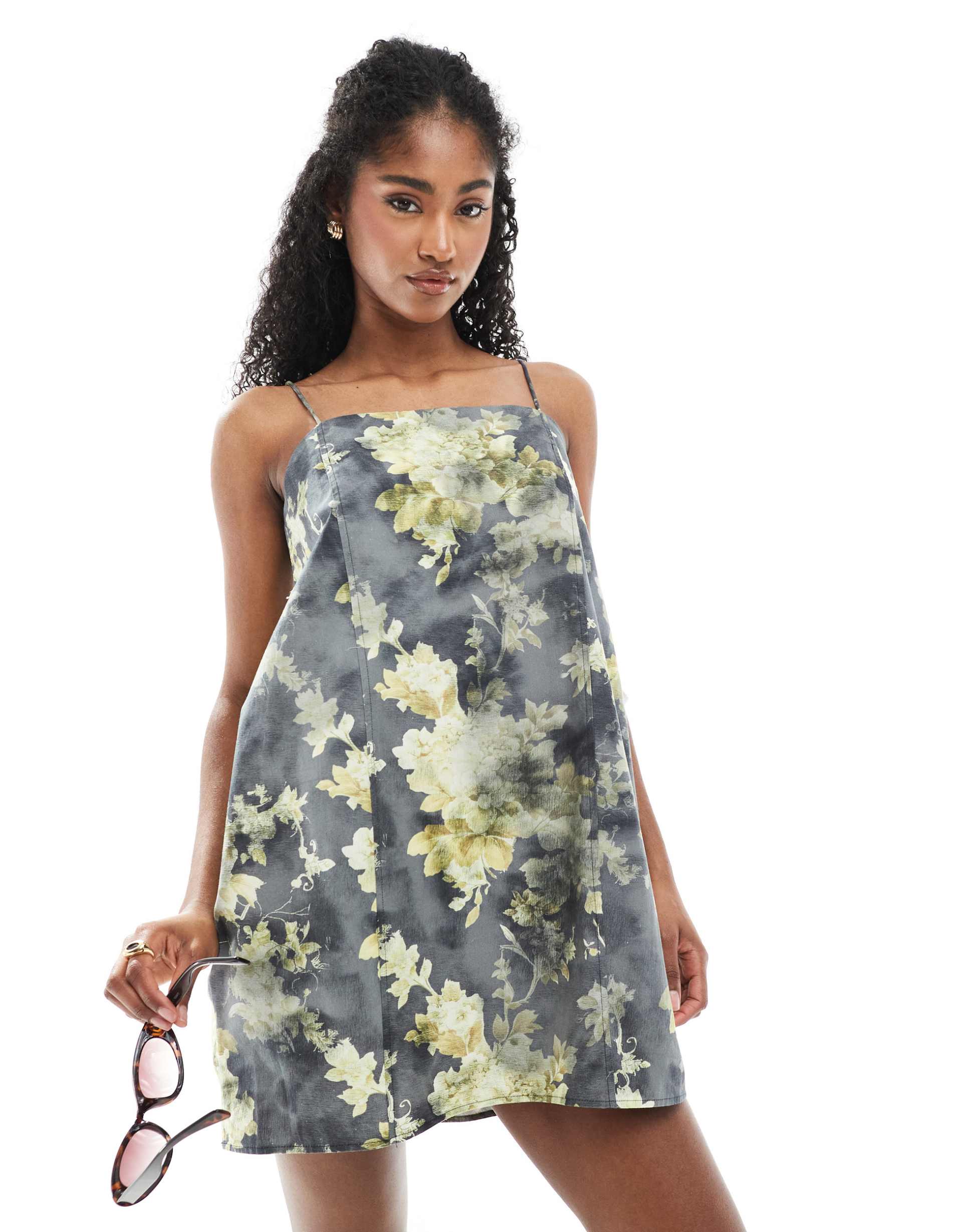 Soft cotton poplin in a crisp gray base is adorned with delicate yellow floral prints, creating a fresh and breezy mini shift silhouette. The square neckline and adjustable tie-up spaghetti straps add a youthful charm, complemented by practical side pockets. Its regular fit and clean hemline make it an effortless choice for spring and summer casual outings, brunches, or vacation days. This lightweight woven fabric dress balances comfort and style with a subtle bow detail on the straps, perfect for warm weather wear.