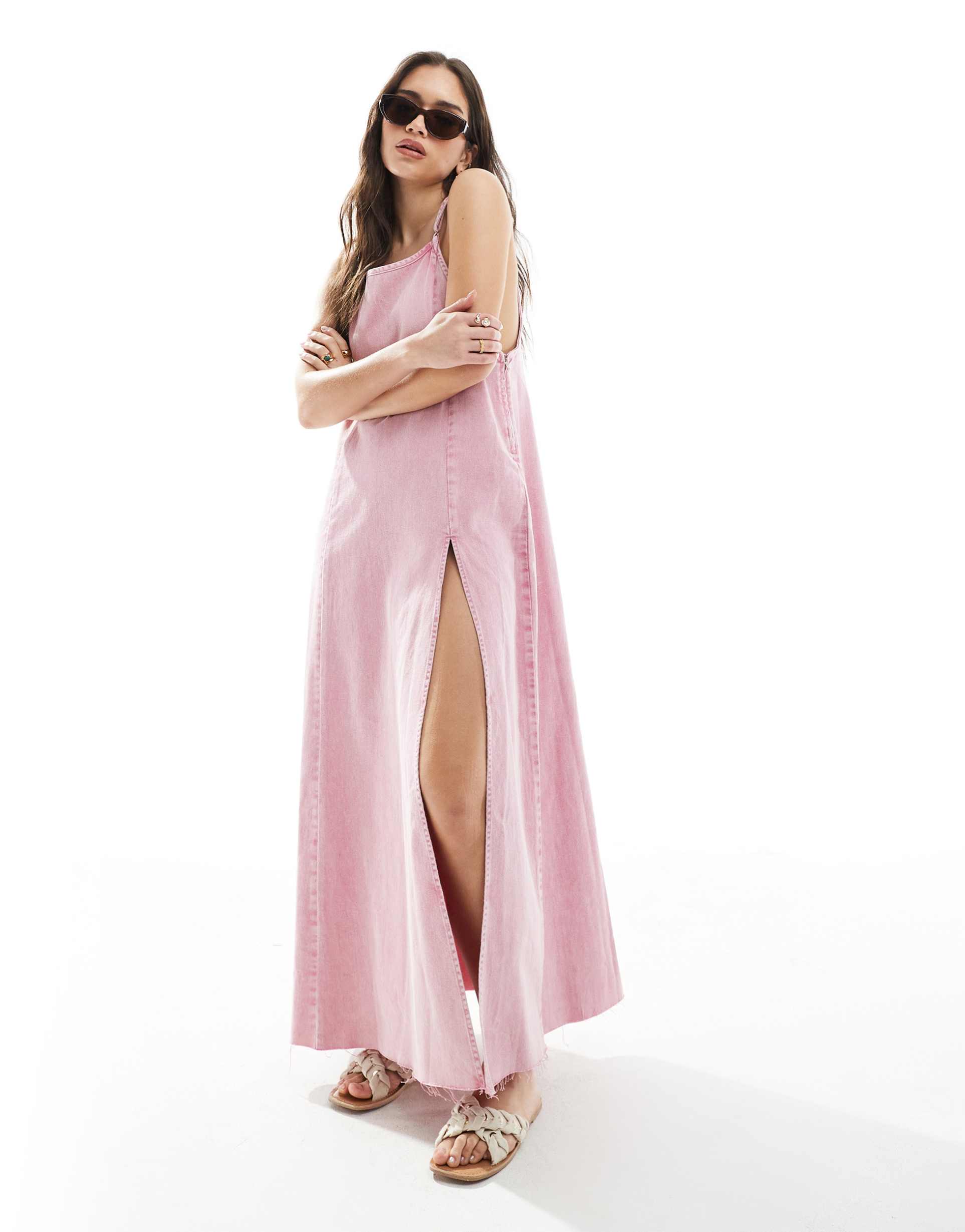 MONKI DENIM CAMI MAXI DRESS WITH FRONT SLIT IN PINK
