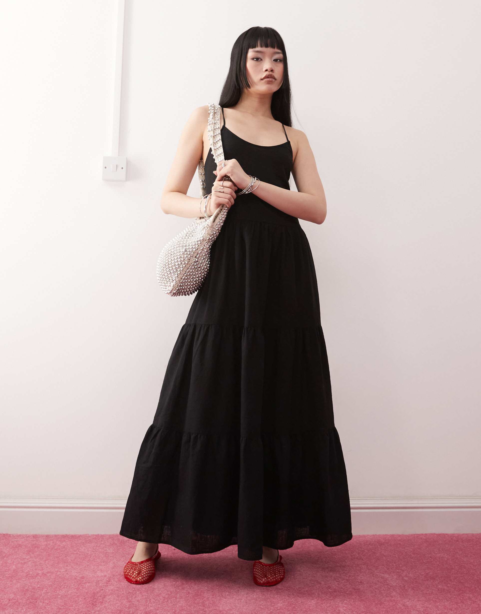 MONKI LINEN TIERED MIDAXI DRESS IN BLACK - EXCLUSIVE TO ASOS