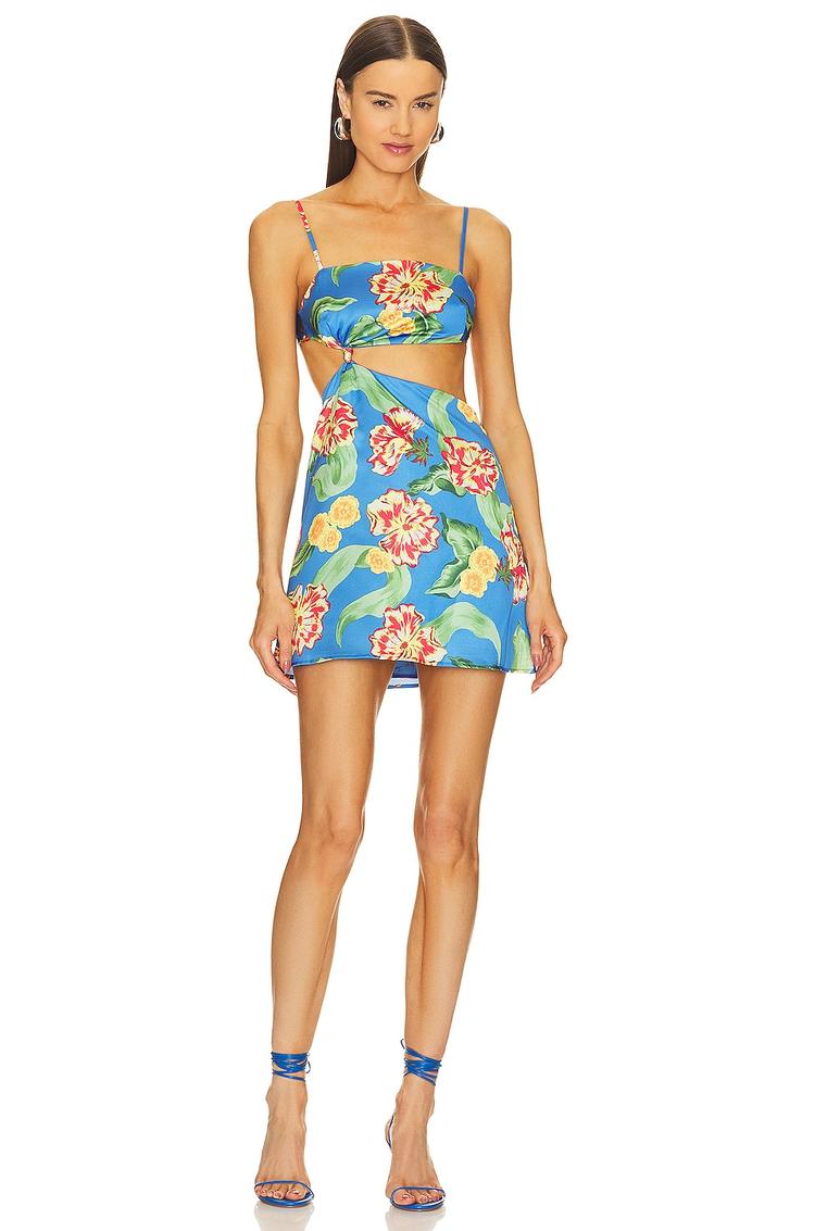 Sunshine-ready with a vibrant floral print on matte blue sateen, this mini shift dress features flattering side and back cut-outs that add a modern edge. Adjustable spaghetti straps and a straight neckline enhance the slim silhouette, while the concealed side zipper and back tie ensure a perfect fit. Crafted from a polyester-spandex blend, it offers a comfortable stretch ideal for summer outings. Perfect for brunch, date nights, or a fun night out, this dress combines trendy style with casual chic vibes for versatile warm-weather wear.