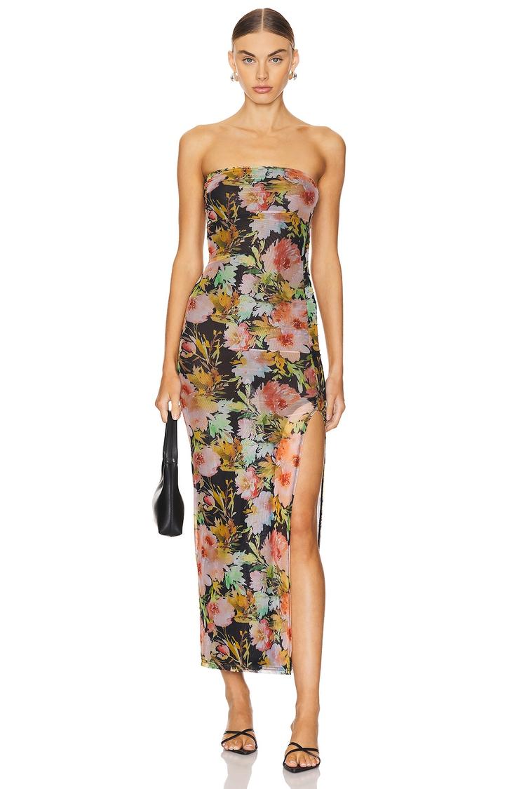 Soft mesh fabric and a sleek slip dress silhouette combine with an elegant floral print for a stunning maxi that effortlessly skims the body. The strapless straight neckline and sleeveless design enhance its modern and sexy vibe, while the side slit adds a touch of allure. Perfect for spring and summer occasions, this fully lined dress is ideal for cocktail parties, date nights, and nights out. The pull-on styling with polyester-elastane blend fabric ensures comfort and stretch for a flawless fit.