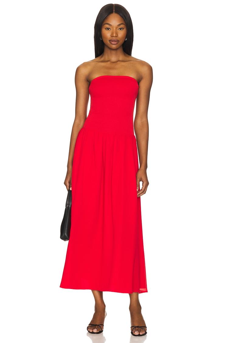 A vibrant bright red maxi dress crafted with a lightweight jersey bodice and flowing chiffon skirt presents a sleek column silhouette. The strapless, straight neckline and sleeveless design enhance its elegant and minimalist appeal. The fitted cut flatters the figure while the pull-on styling with elastic neckline ensures comfort. Perfect for spring and summer occasions such as brunch, date nights, or evening outings, this dress blends classic style with modern ease, promising effortless sophistication in any setting.