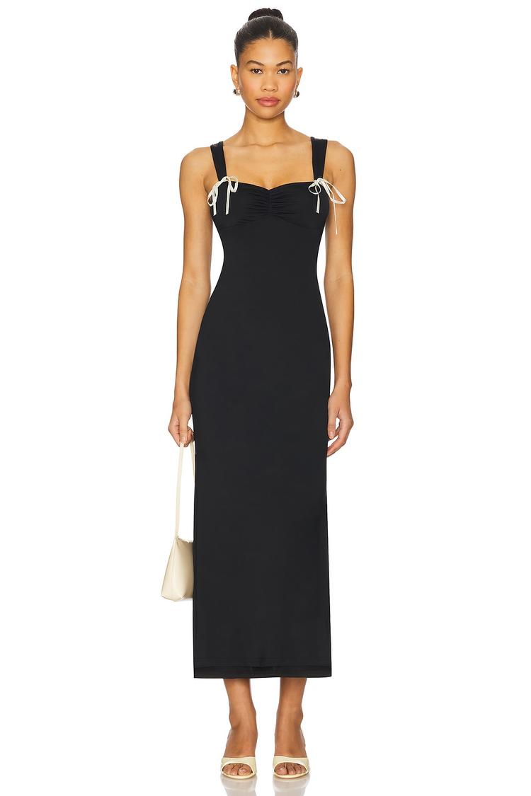 Sleek and sophisticated, this matte black sheath dress features a square neckline and wide straps adorned with delicate satin ribbon ties. The midi length and fitted silhouette highlight a ruched bust design crafted from midweight jersey fabric with a smooth lining for comfort. Perfect for cocktail parties, date nights, or an elegant night out, this minimalist dress blends chic style with subtle detailing to enhance your evening look effortlessly.