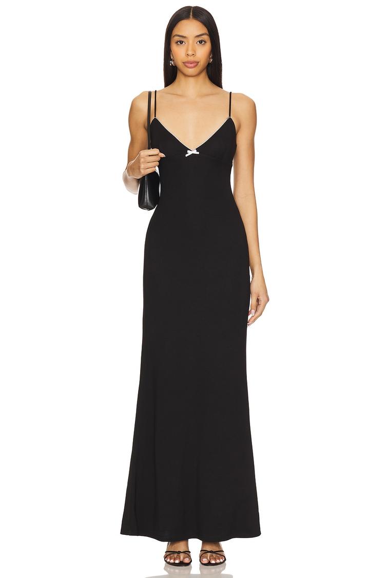 Softly flowing in a sleek maxi silhouette, this slip dress features a slimming V-neckline and delicate spaghetti straps that enhance its minimalist elegance. Crafted from a midweight jersey fabric blend of viscose, nylon, elastane, and polyester, it offers comfortable stretch and a smooth finish. The subtle contrast bow detail at the bust adds a charming focal point to this timeless black dress. Ideal for sophisticated date nights, cocktail parties, or formal weddings, it effortlessly combines classic style with modern comfort for versatile wear across spring, summer, and autumn seasons.