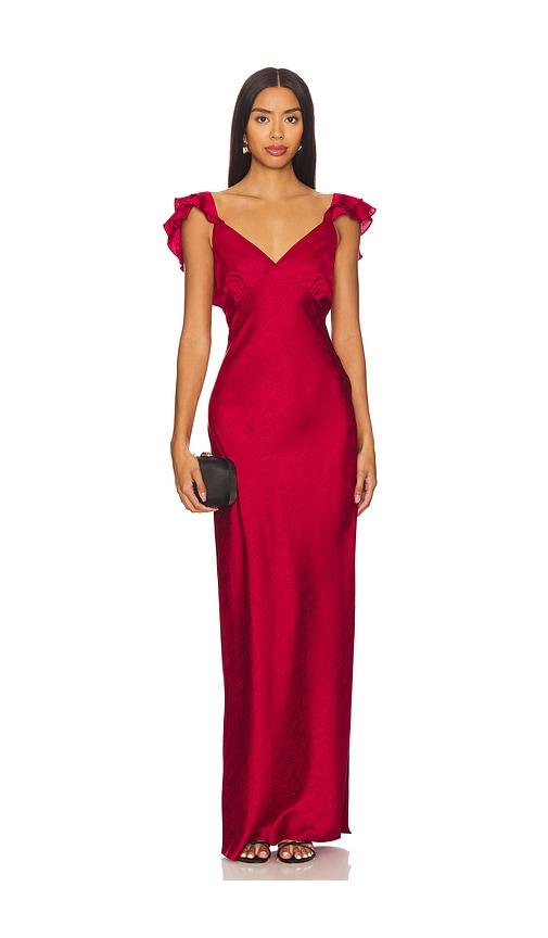 MORE TO COME BECKY RUFFLE MAXI DRESS IN WINE.