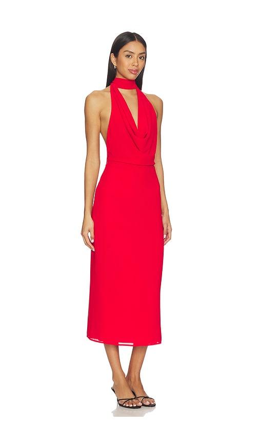 MORE TO COME RIA HALTER MIDI DRESS IN RED.