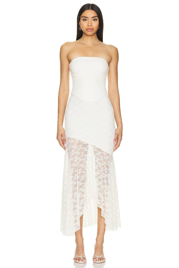 Delicate lace fabric and a strapless neckline define this elegant slip dress, featuring a fitted silhouette and an asymmetric maxi hem with sheer panels. The partially lined design offers a sophisticated yet minimalistic vibe, perfect for warm spring and summer evenings. Ideal for cocktail parties, date nights, and night outs, its pull-on styling and stretchy nylon blend ensure comfort alongside style. The intricate lace trim all over adds a romantic touch to this versatile piece, making it a standout choice for refined occasions.