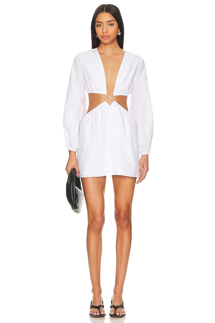 Lightweight cotton poplin meets a mini shift silhouette with a modern edge in this white dress featuring daring front and back cut-outs. The plunging neckline and long blouson sleeves with cinched cuffs bring a sexy yet sophisticated vibe, while the tie-back closure enhances the fit. Ideal for spring and summer evenings, it’s a versatile choice for cocktail parties, night outs, and date nights that balances comfort with striking style.