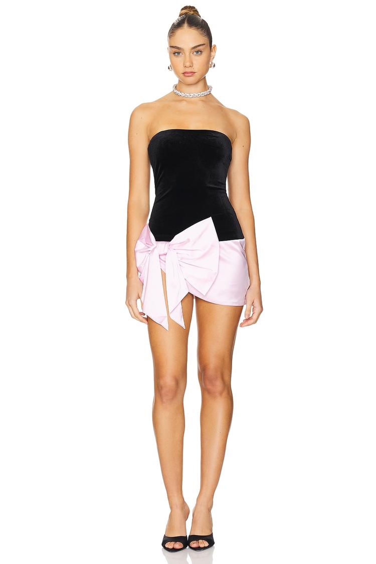 A sleek velvet bodice meets a soft satin bow accent in this fitted strapless slip dress. The straight neckline and mini length create a chic, sexy silhouette perfect for date nights, cocktail parties, or stylish evenings out. Crafted from a smooth polyester blend, this dress combines elegance with comfort, featuring a hidden back zipper for a seamless finish. The subtle contrast between matte black velvet and light pink satin adds a delicate feminine touch, making it an ideal choice for various occasions requiring a polished, sophisticated look.