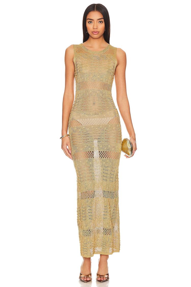 Soft viscose and an open knit crochet texture create a subtly sheer, slim silhouette in this beige midi dress. Its sleeveless design and crew neckline enhance the bohemian vibe while offering breathability perfect for summer days. The clean hemline and covered back maintain a minimalist aesthetic, making it ideal for brunch, date nights, or casual evenings out. Pull-on styling adds ease to this casual chic piece that blends comfort with effortless style.