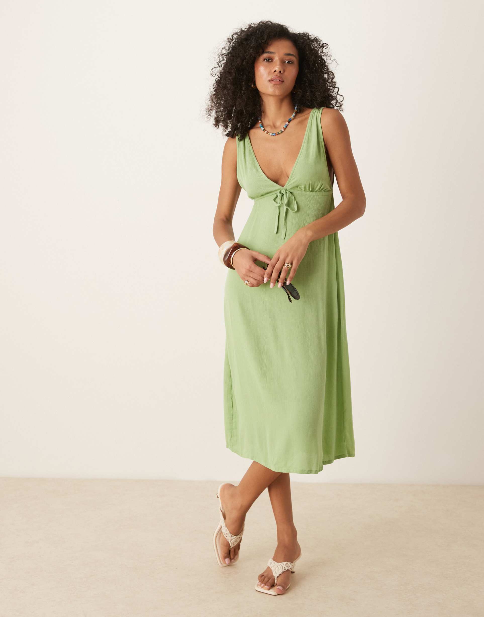 MOTEL HAVISLA TIE FRONT MIDAXI DRESS IN SAGE GREEN