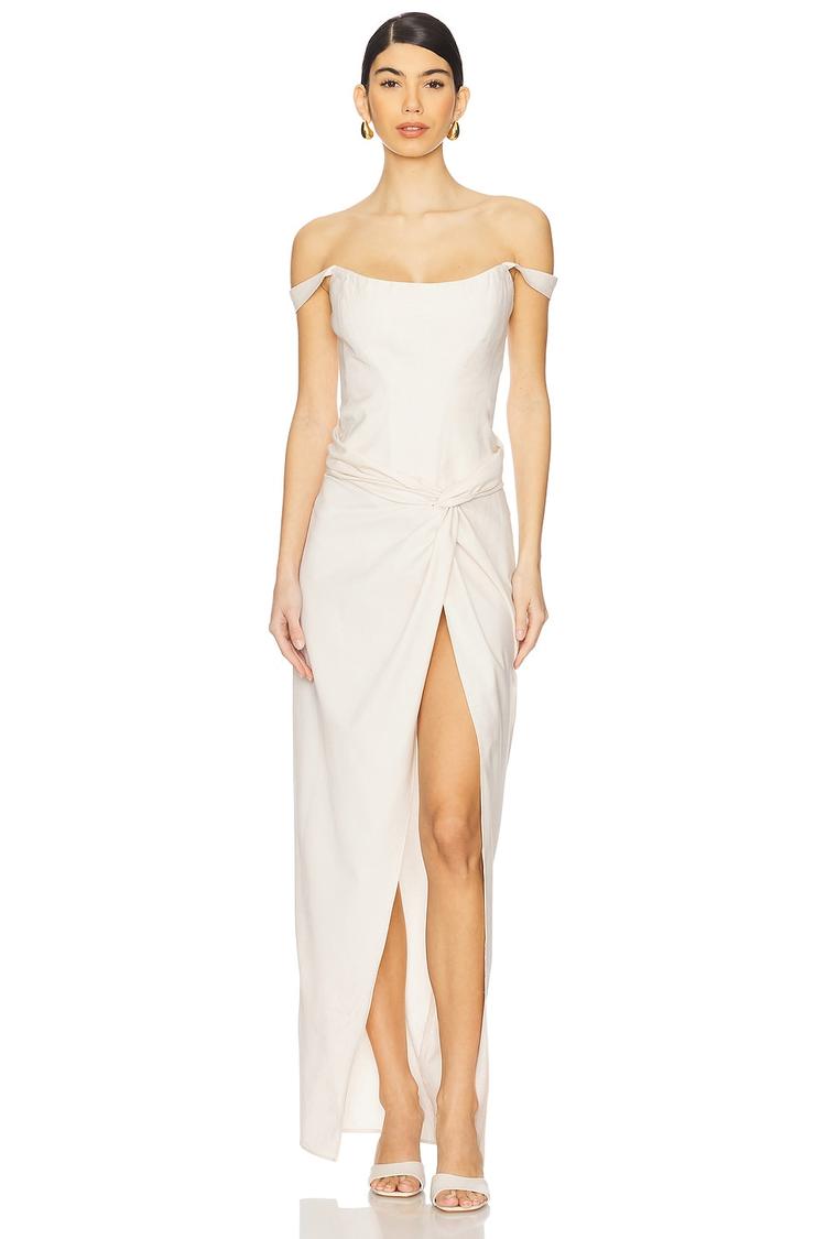 Softly structured with a boned bodice and elegant off-shoulder straight neckline, this off-white column dress is crafted from a midweight taffeta blend of polyester, viscose, wool, and elastane. The fitted silhouette cascades into a clean maxi hem with a daring side slit and subtle front knot draping, complemented by a delicate back lace-up tie closure. Ideal for formal evenings, cocktail parties, and sophisticated night outs, this dress balances classic elegance with modern allure for autumn and winter occasions.