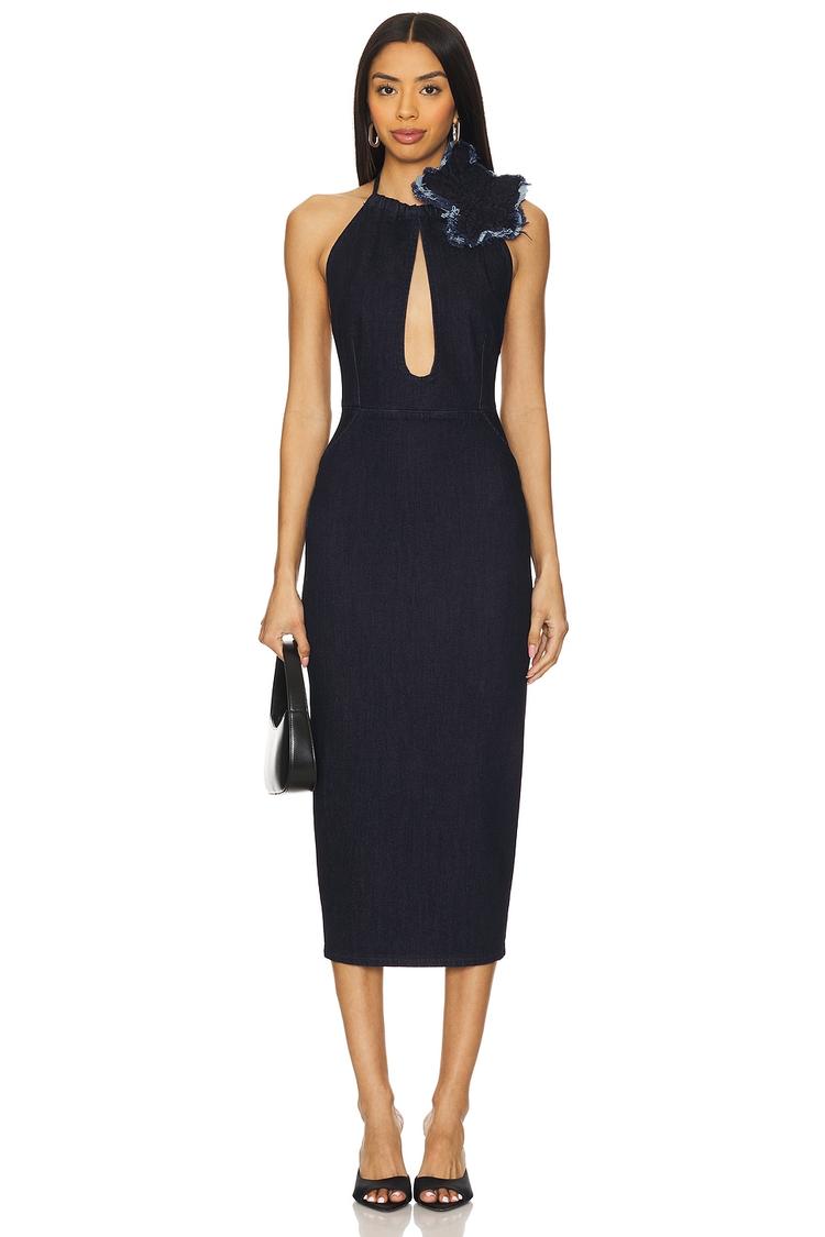 Structured matte black denim shapes a sleek sheath silhouette with a flattering halter neckline and a daring front cut-out. The midi length and fitted cut enhance an elegant yet modern vibe, while the frayed floral ruffle detail on the front adds a touch of edgy sophistication. Designed with a self-tie closure at the back and a zipper for secure fit, this dress combines comfort with style thanks to its cotton-spandex blend fabric. Ideal for spring and summer evenings, it fits perfectly for cocktail parties, night outs, and intimate date nights.