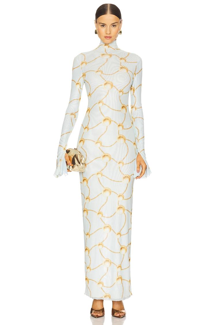 Lightweight mesh fabric enhances the elegant, fitted column silhouette of this maxi dress, featuring a sophisticated mock neck and long sleeves. The clean hemline and all-over abstract gold pattern on a white base offer a minimalist yet striking look. Ideal for cocktail parties, formal occasions, and night outs, this pull-on style dress combines comfort with refined style, perfect for year-round wear. Its understated design and luxurious gold accents make it a standout piece for sophisticated evening events.