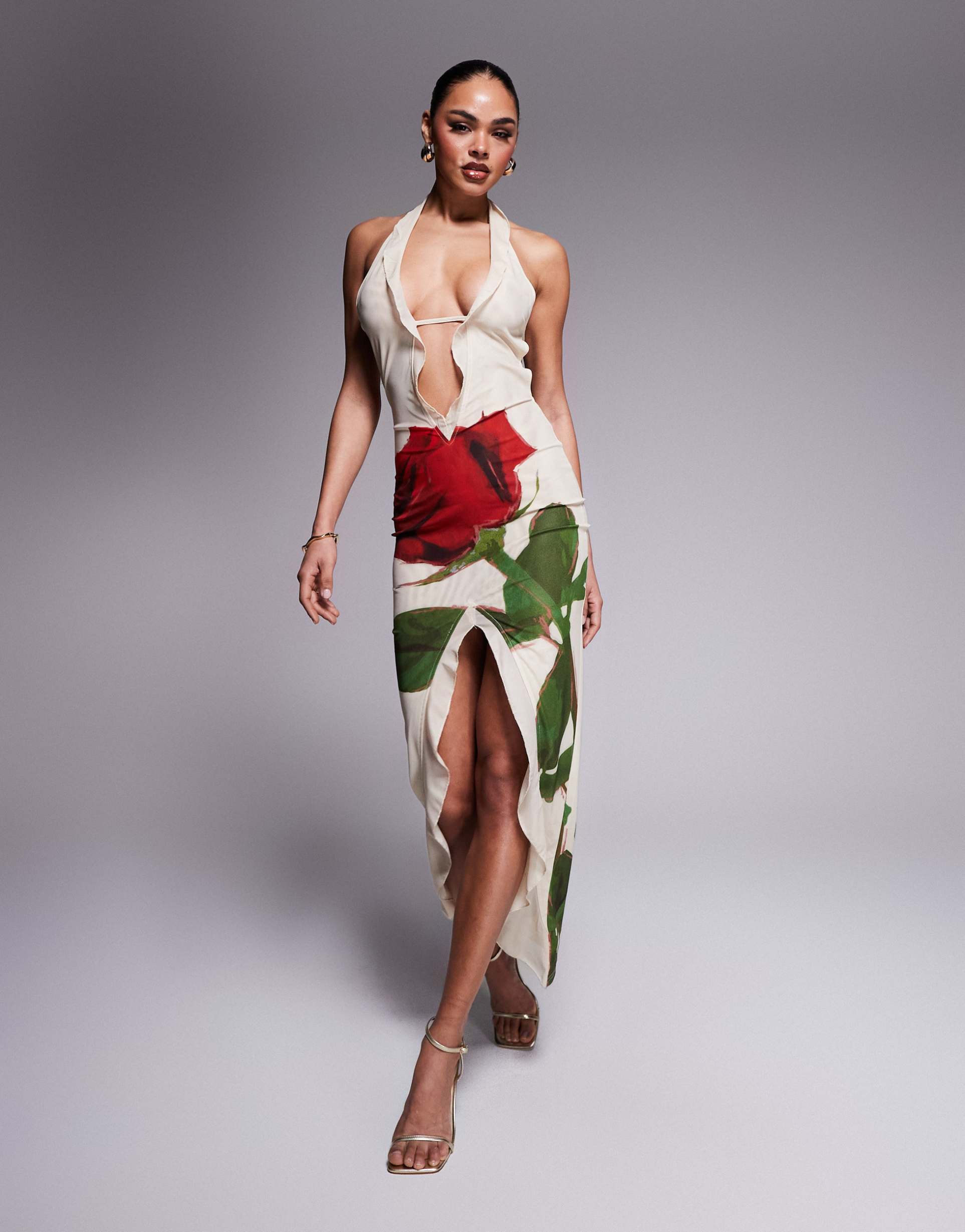 MURCI EXCLUSIVE MESH RUFFLE HALTERNECK DEEP PLUNGE FRONT SPLIT OPEN BACK MAXI DRESS IN CREAM ROSE PRINT