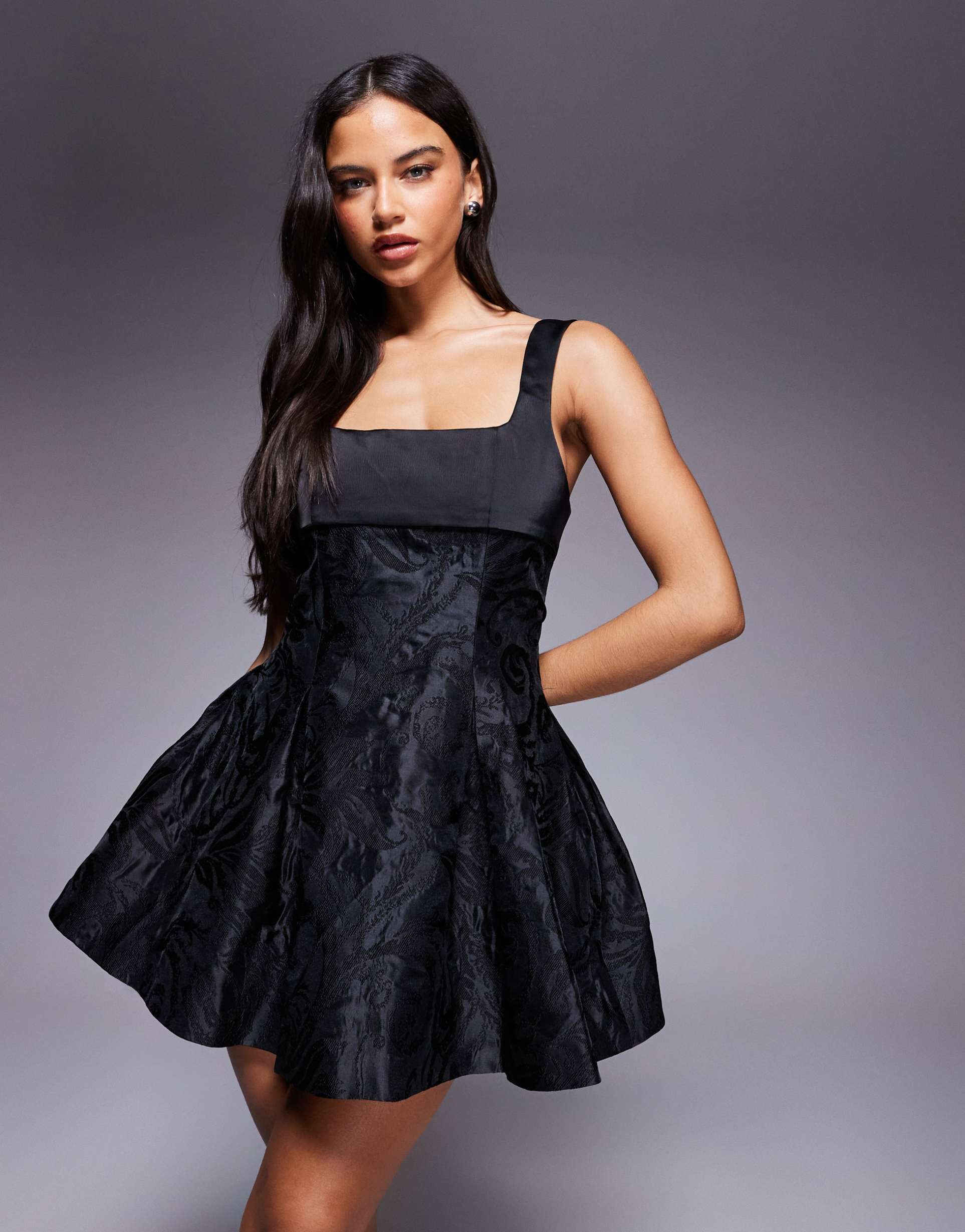 MURCI SATIN JACQUARD SQUARE NECK BOW TIE BACK MINI DRESS IN BLACK