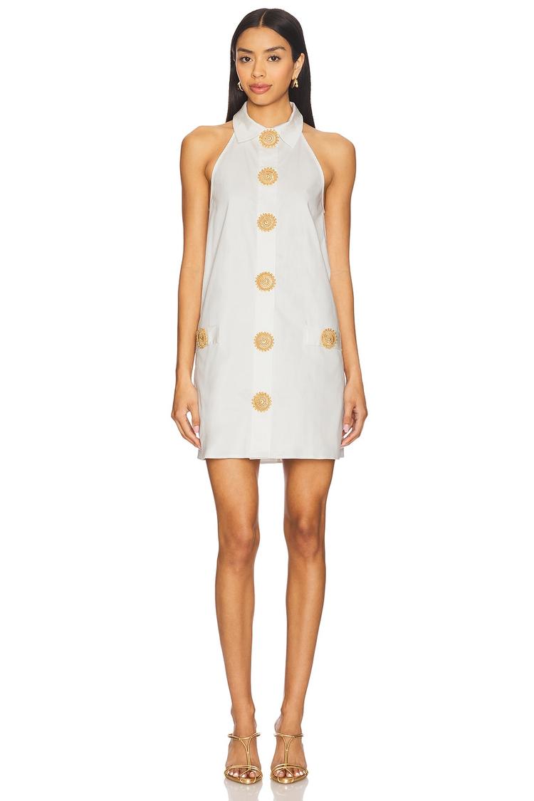 Soft woven stretch cotton blend fabric forms a chic, sleeveless mini shift dress with a high neckline and front snap button closures. The clean hem and front embroidered details add subtle contrast, while faux welt pockets enhance casual utility. Its regular fit and lightweight twill make it perfect for spring and summer outings, whether it's brunch, a casual date night, or a vacation getaway. The minimalist style combined with breathable fabric ensures effortless comfort and timeless appeal.