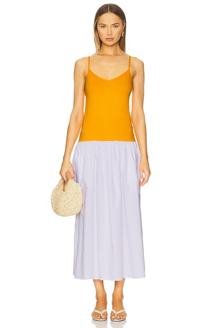 The luxe cotton and cashmere blend bodice in a vibrant matte orange pairs effortlessly with a flowing white poplin midi skirt, creating a breezy slip dress perfect for spring and summer. Featuring adjustable spaghetti straps, a straight neckline, and a relaxed fit with an elastic drop waist, this dress offers comfort and style. Functional side seam pockets add practicality while the clean hemline enhances its minimalist chic aesthetic. Ideal for casual outings, brunches, or date nights, this versatile slip dress combines softness and breathability for easy, elegant wear.