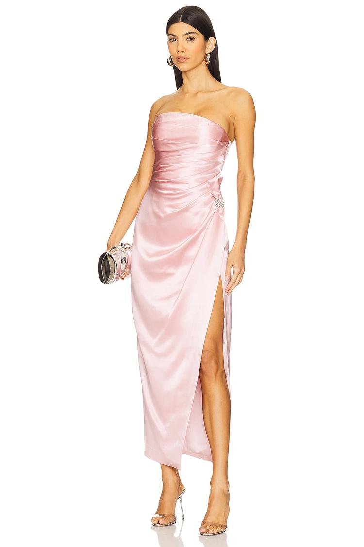 Soft satin fabric and a sleek column silhouette come together in this elegant strapless maxi dress. Featuring a fitted boned bodice with a straight neckline and a daring thigh-high slit, it exudes sophistication. The dress is fully lined with a hidden back zipper for a smooth finish, while delicate pearl accents on the side add a subtle touch of glamour. Ideal for cocktail parties, formal events, and romantic date nights, this shimmery light pink gown ensures you stand out with understated grace.