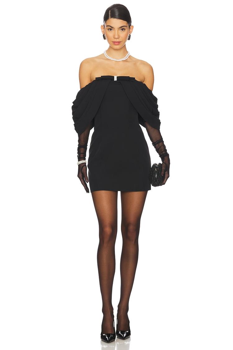 A sleek black mini sheath dress crafted from crepe fabric offers a fitted silhouette perfect for evening affairs. The off-shoulder straight neckline is elegantly adorned with a satin bow and stone jewel accent, adding a sophisticated focal point. Its concealed back zipper ensures a smooth, clean look while the fully lined design enhances comfort. Ideal for date nights, cocktail parties, or night outs, this classic dress blends timeless style with refined details to elevate your wardrobe for special occasions.