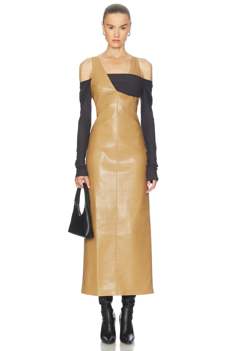 Matte tan faux leather defines this sleek slip dress with a halter neck and slim fit silhouette that skims the body elegantly. The midi length and clean hemline create a modern, sophisticated vibe perfect for autumn and winter occasions. Layer it with contrasting pieces for a standout cocktail, date night, or night out look. Crafted from a blend of wool, polyester, and polyurethane, this dress offers luxe texture and warmth, making it a chic choice for semi-formal events and stylish evenings.