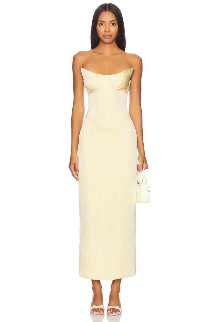 Soft matte beige satin fabric shapes a fitted column silhouette that skims the body with elegance. The strapless straight neckline complements the contour bust, while the back features a delicate lace-up tie detail for a refined touch. A hidden side zipper ensures a smooth fit, and the midi length with a subtle slit at the back adds graceful movement. Perfect for cocktail evenings, date nights, or sophisticated night outs, this fully lined dress blends comfort with polished style for all-weather wear.