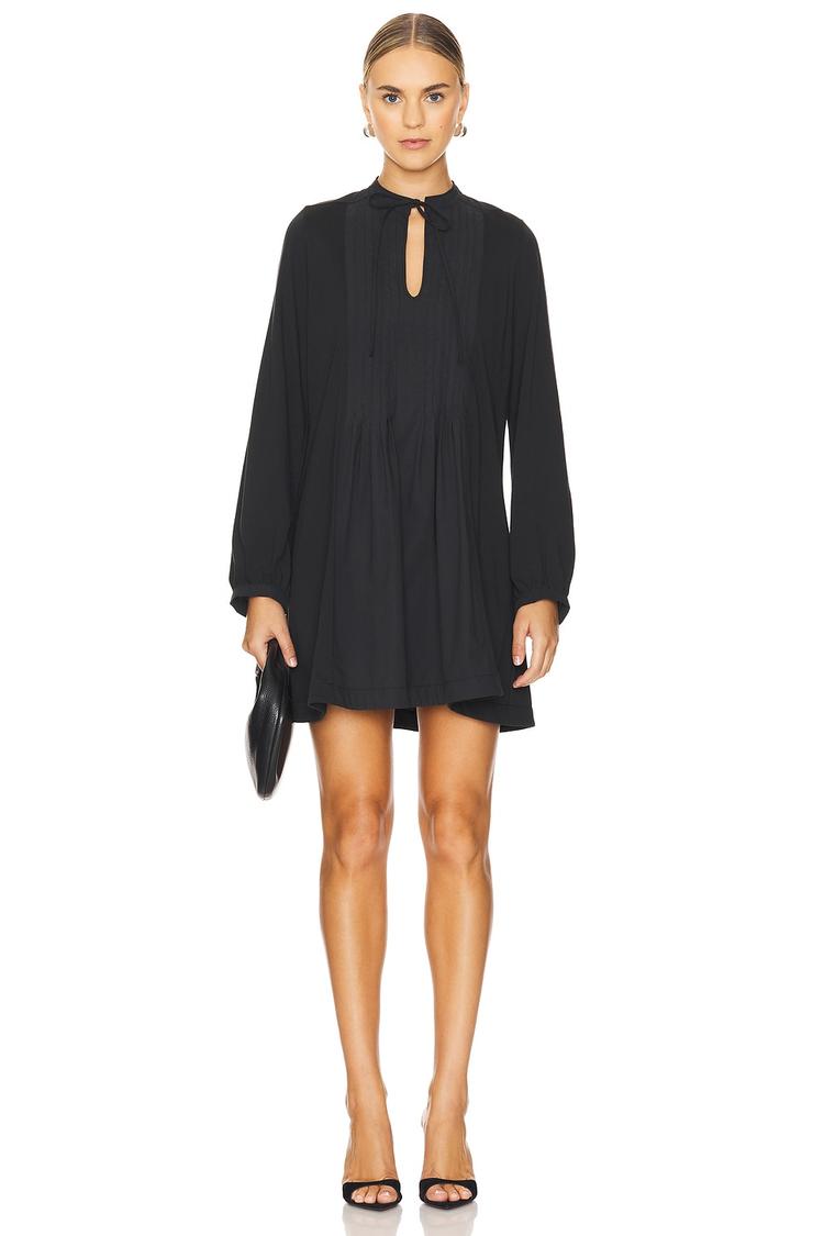 Soft matte black organic cotton shapes a breezy babydoll silhouette with delicate pintuck pleats on the front, lending subtle texture and movement. The mini length and long cuffed sleeves balance ease with elegant coverage, while the keyhole neckline with front tie adds a charming focal point. Lightweight and unlined, this dress is perfect for casual brunches, everyday outings, or relaxed date nights during spring and summer. Classic yet casually chic, it offers effortless style and breathable comfort in warm weather.