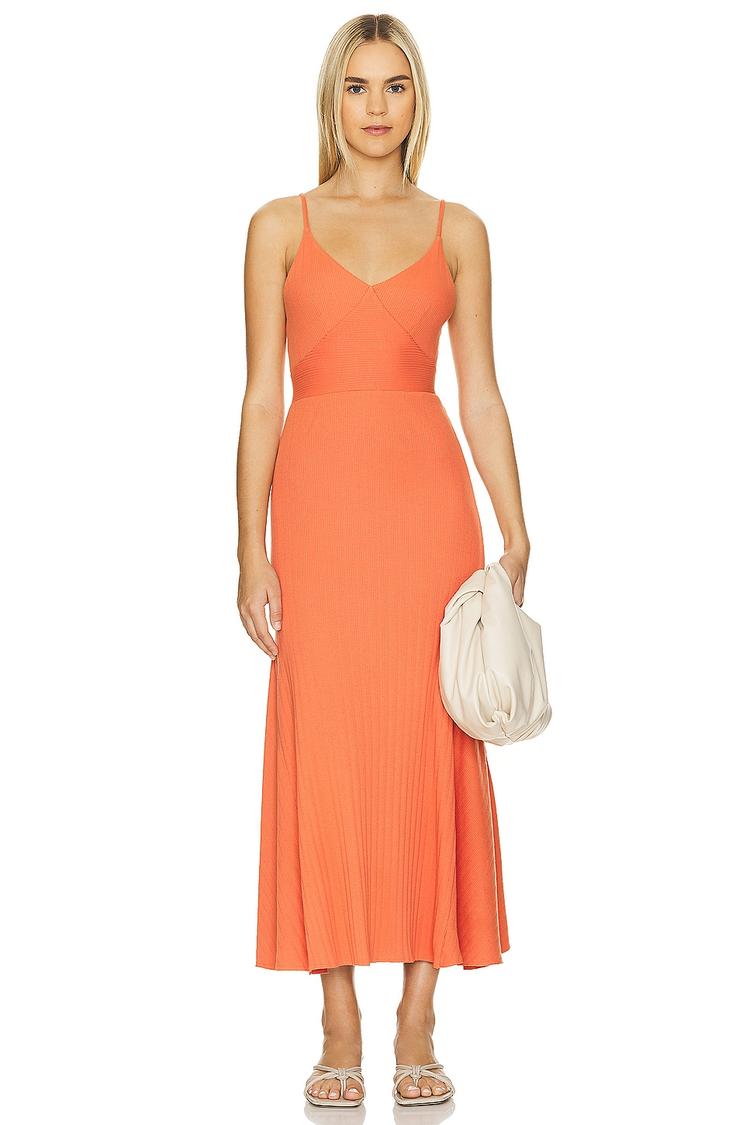 Soft ribbed fabric crafted from organic pima cotton with a touch of elastane shapes a fitted, midi-length slip dress. The matte orange hue complements the minimalist design, featuring delicate spaghetti straps and a flattering V-neckline. Its clean hemline and pull-on styling make it an easy, versatile choice for warm spring and summer days. Ideal for casual outings, date nights, or vacation wardrobe, this slip dress delivers comfort and understated chic in one sleek silhouette.