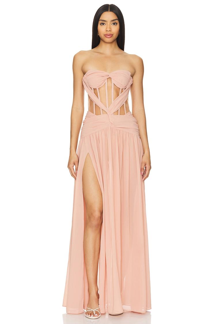 Soft blush hues and a figure-hugging corset silhouette define this elegant maxi gown. Featuring a strapless straight neckline and an open back with a concealed zipper, it offers a modern and sexy look. The flowing skirt with a high side slit adds movement and allure, crafted from lightweight polyester, nylon, and elastane for a comfortable yet fitted feel. Ideal for cocktail parties, night outs, or romantic date nights in spring and summer, this gown blends sophistication with daring design details for standout style.