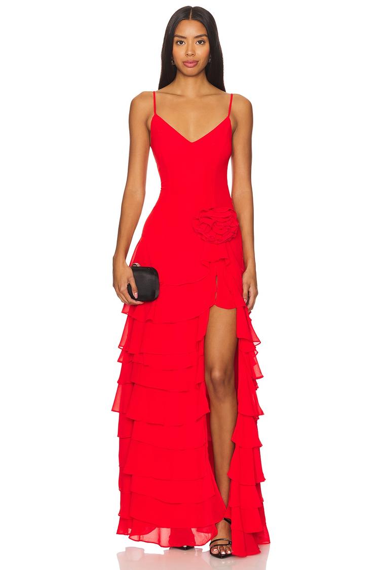 red tiered chiffon gown