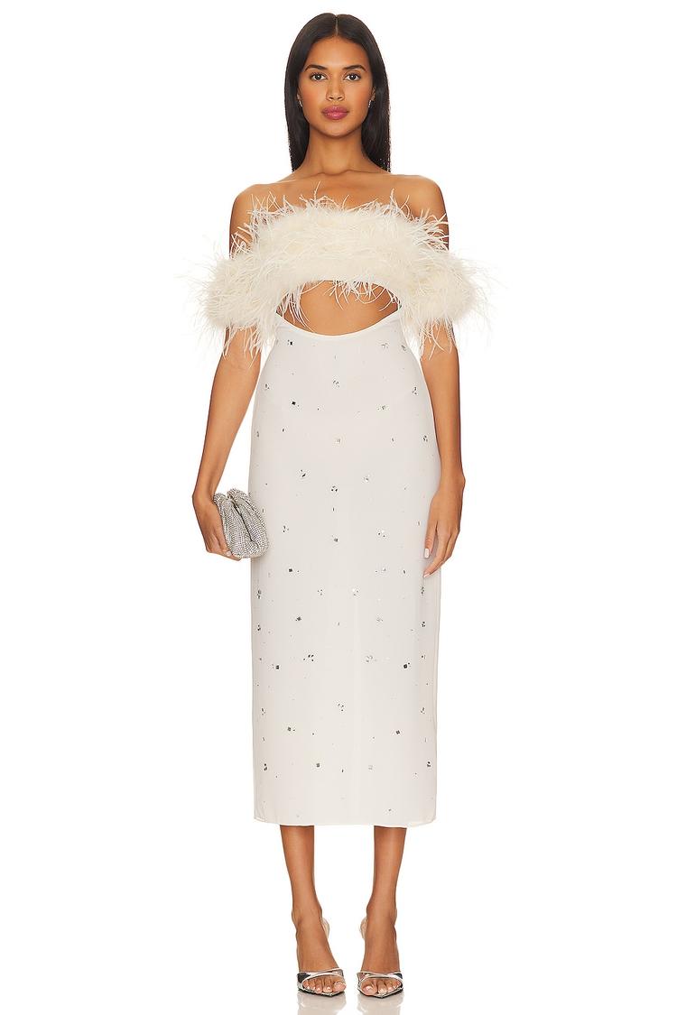 Soft off-white polyester forms a fitted sheath silhouette with a sophisticated off-shoulder neckline trimmed in delicate feathers. Crystal embellishments shimmer all over the midi-length dress, enhancing its elegant appeal. A subtle back vent and concealed zipper closure provide comfort and ease. Perfectly suited for cocktail events, semi-formal occasions, and chic night outs, this midi dress blends refined design with standout details to elevate your wardrobe.