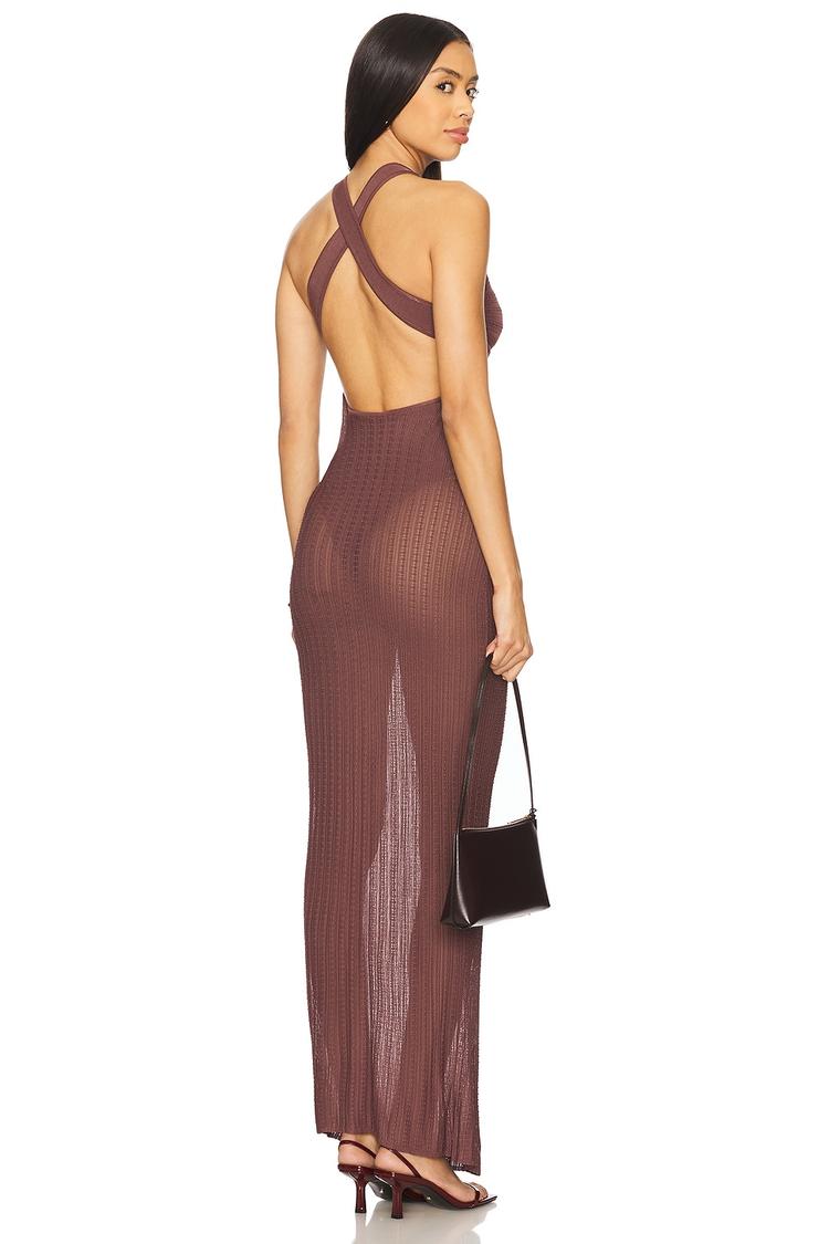 Softly textured knit in a semi-sheer matte brown fabric creates a sultry, bodycon maxi silhouette with a flattering U-neckline and sleeveless design. The crossover straps and criss-cross open back add a modern, sexy edge, while the attached bodysuit lining with snap button gusset ensures comfort and fit. This viscose-elastane blend dress is ideal for summer nights, cocktail parties, and date nights, offering a trendy yet elegant look that highlights your silhouette effortlessly.