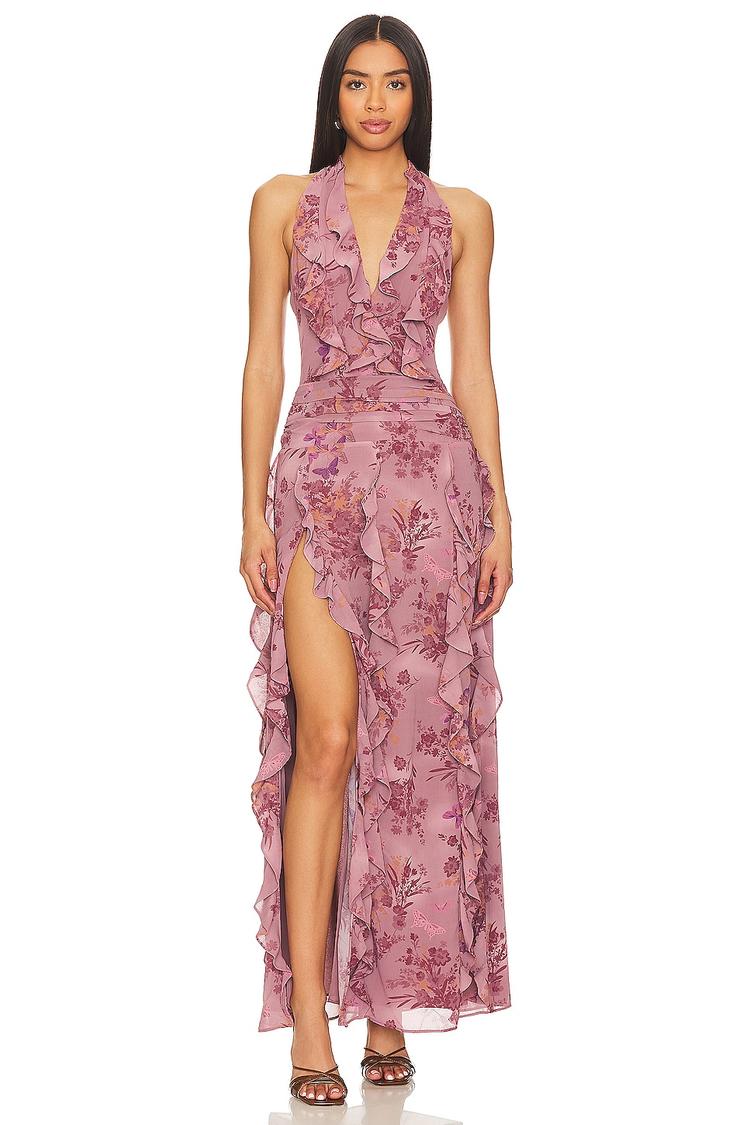 Soft georgette fabric and a flowing A-line silhouette create an effortlessly feminine look in this mauve floral maxi dress. The halter neckline and sleeveless design highlight the shoulders, while ruffled trims cascade alongside a side slit for romantic movement. Fully lined and featuring a hidden back zipper with tie closure, it blends comfort with sophistication. Ideal for cocktail parties, date nights, or elegant evenings, this dress pairs beautifully with kitten heels or boots for versatile styling across spring and summer seasons.