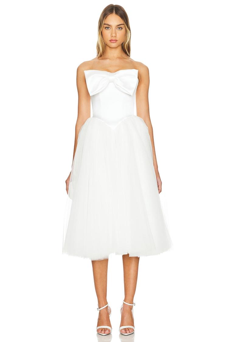 Soft satin fabric paired with a flowing chiffon skirt creates an elegant fit and flare silhouette in this strapless midi dress. The straight neckline and boned bodice offer a flattering, fitted shape, while the front bow accent adds a romantic touch. Ideal for spring and summer occasions, this white dress suits cocktail parties, semi-formal events, weddings, and engagement celebrations with its classic and sophisticated style. Finished with a clean hemline and a back zipper closure, it combines timeless elegance with modern comfort.