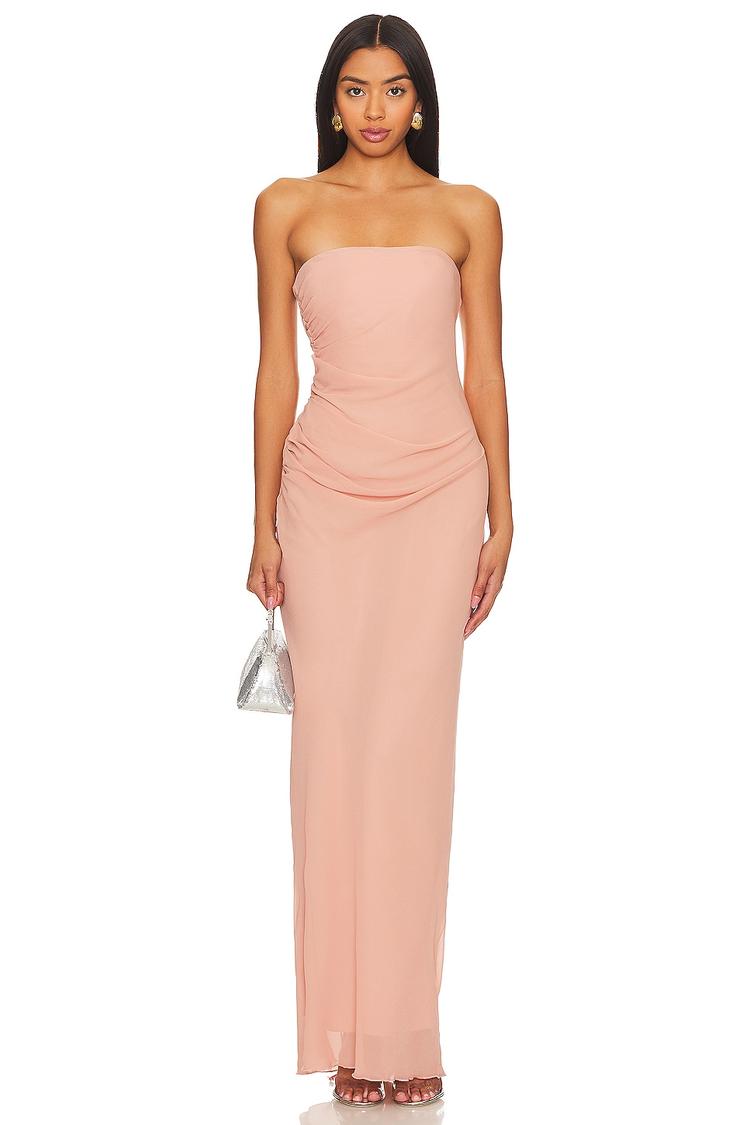 Soft chiffon fabric drapes elegantly over a figure-hugging column silhouette, featuring a strapless straight neckline and a clean maxi hem. This fitted gown is fully lined with a boned bodice for structured support, complemented by a hidden back zipper closure and delicate draping details at the back and front. Its matte dusty rose hue offers a timeless, sophisticated look perfect for cocktail parties, formal events, and wedding guest occasions during spring and summer.