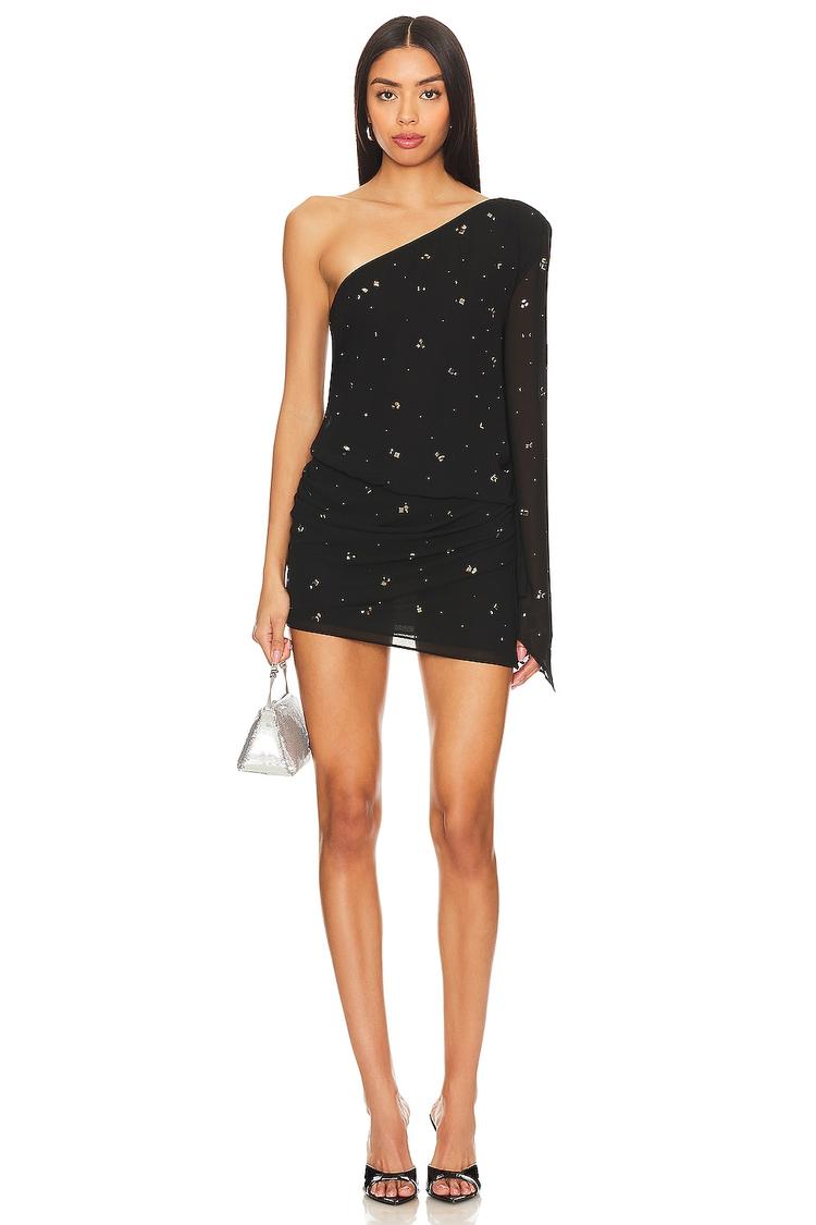 A sleek silhouette meets '80s disco glam in this fitted mini dress featuring a one-shoulder strap and sleeveless design. Crafted from lightweight chiffon and polyester, the matte black fabric is adorned with sparkling silver crystal embellishments all over, creating a dazzling effect. The clean hemline and concealed side zipper ensure a smooth finish. Ideal for night outs, cocktail parties, and girls' nights, this modern and trendy shift dress brings effortless glam to any chic event.