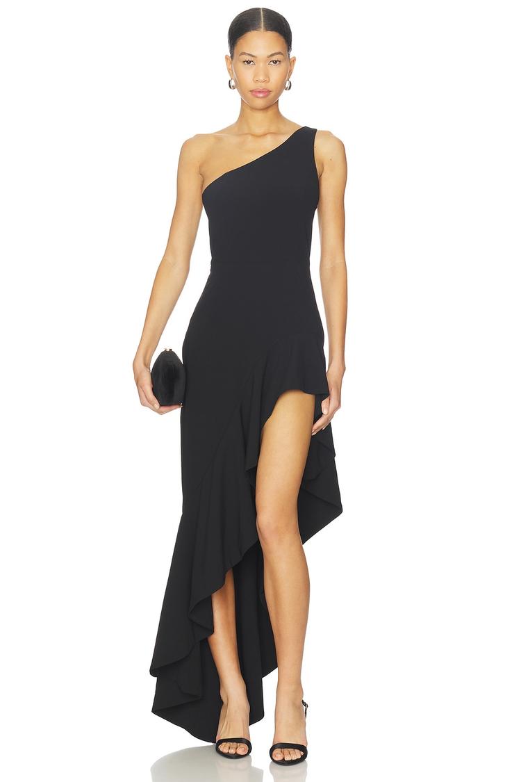 Grace the evening in a sleek, fitted column gown crafted from midweight crepe polyester with elastane stretch. The asymmetric neckline and single strap beautifully frame the shoulders, while a high-low hem with ruffle detailing adds dynamic movement and elegance. This black gown features a hidden side zipper and a daring side slit for ease and allure. Ideal for cocktail parties, date nights, and night outs, its sophisticated silhouette and smooth fabric offer a modern yet timeless vibe.