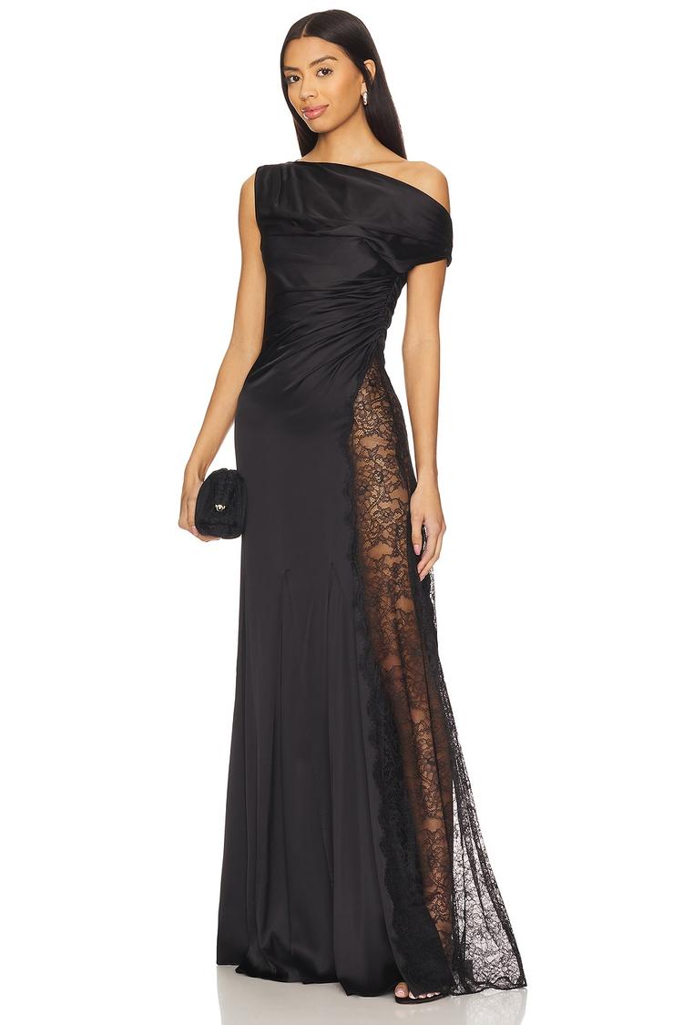 Sleek and sophisticated, this matte black column gown features an asymmetric neckline with a striking one-shoulder design and wide strap detail. Crafted from midweight viscose satin, it offers a fitted silhouette that gracefully skims to a clean maxi hem. A sheer lace trim cut-out on the skirt adds an alluring touch of elegance, perfect for cocktail parties, semi-formal events, or date nights. The hidden side zipper ensures a smooth finish, while the partially lined bust provides comfort and subtle support. Timeless and refined, this gown is a standout choice for elevated evening occasions.