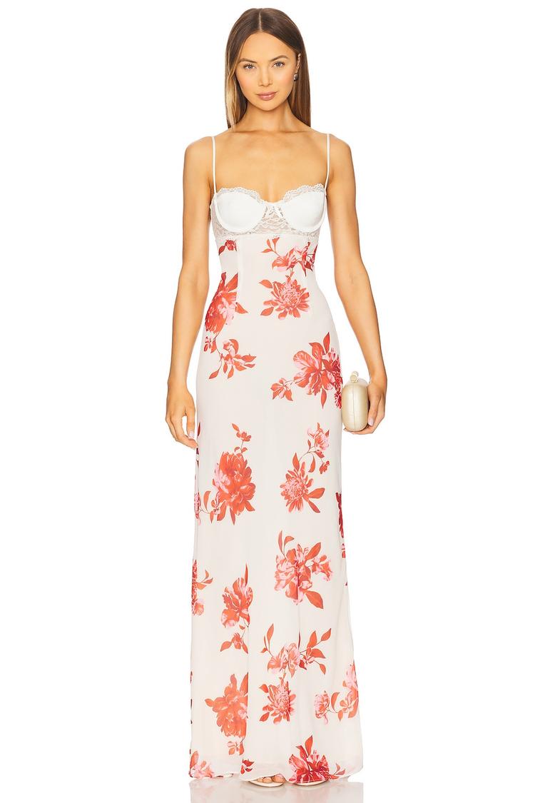 Delicate chiffon and lace combine in this elegant slip dress featuring a fitted silhouette and a flowing maxi hem. The sweetheart neckline and adjustable spaghetti straps frame the lace bustier, while the hidden back zip and hook closure ensure a sleek finish. The dress’s all-over red floral print on a white base adds romantic charm, perfect for spring and summer occasions. Ideal for cocktail parties, wedding guests, or date nights, this sophisticated gown blends comfort with refined style.