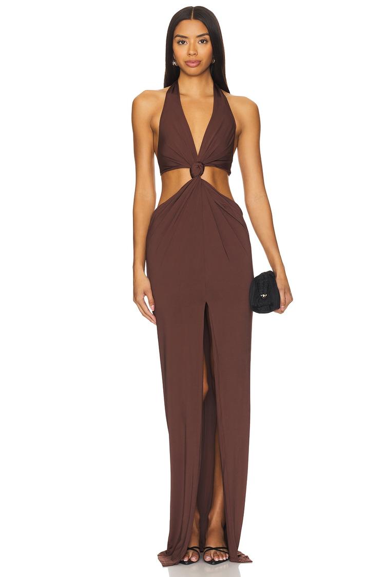 Sleek and sultry, this matte brown column gown features a flattering halter neckline and open back with ruching detail that enhances its fitted silhouette. The maxi length with a daring front slit adds a sophisticated edge, while the cut-out waist and front knot tie accentuate curves beautifully. Crafted from a slinky viscose-elastane blend, it offers a comfortable stretch perfect for warm seasons. Ideal for cocktail parties, night outs, or romantic date nights, this modern and trendy gown is designed to turn heads effortlessly.