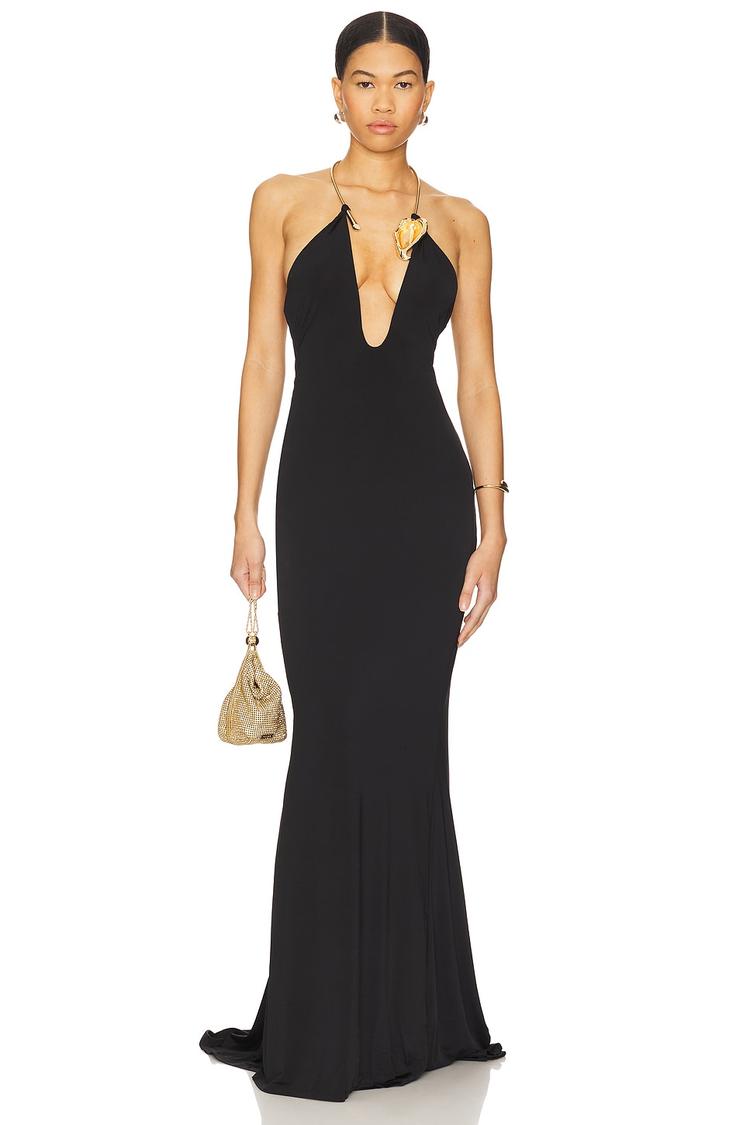 A sleek matte black column silhouette defines this Sansa Maxi Dress, crafted from heavyweight slinky viscose jersey with elastane for a fitted, flattering shape. The plunging neckline and halterneck styling with metallic gold hardware add an elegant, sexy touch, complemented by an open back and clean maxi hem. Ideal for cocktail parties, formal evenings, and night outs, this sophisticated dress combines comfort with standout design details for versatile wear.
