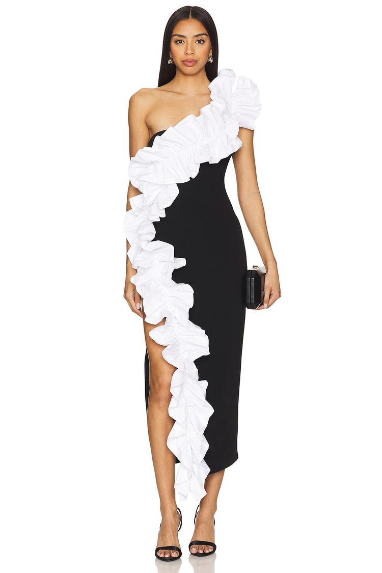 A striking column silhouette in matte black crepe fabric exudes elegance and sophistication. This midi dress features a fitted shape that enhances the figure, with a dramatic white ruffled one-shoulder strap cascading down the front. The sleeveless design and strapless neckline add a modern edge, while the side slit offers subtle allure. Crafted from a polyester-elastane blend with cotton contrast, it ensures comfort and style. Ideal for cocktail parties, date nights, or a chic night out, this dress blends classic refinement with standout detailing.