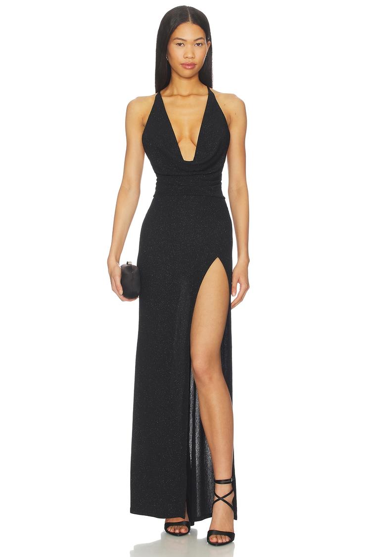 A plunging cowl neckline and slim column silhouette define this striking maxi gown in matte black jersey fabric. Featuring a daring thigh-high slit and a criss-cross open back, it exudes modern sophistication and sexiness. The concealed back zipper ensures a sleek fit, while the stretch polyester-elastane blend offers comfort and ease of movement. Ideal for cocktail parties, formal events, or a glamorous night out, this gown commands attention with its elegant design and flattering cut.