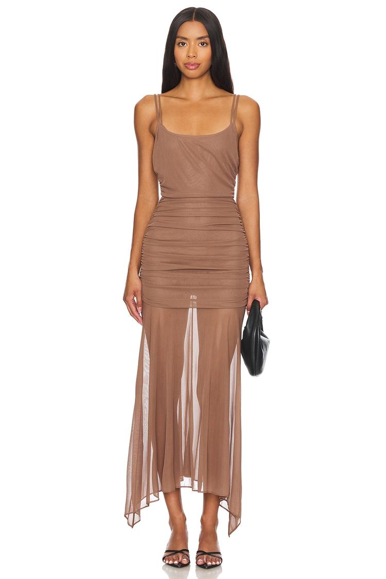 Soft matte brown mesh fabric and a figure-hugging slip silhouette highlight the allure of this maxi dress. Featuring a sexy plunge back and adjustable spaghetti straps, the bodycon fit is enhanced with ruched sides that add texture and shape. The asymmetric sheer hemline flows beautifully for a modern, trendy look. Concealed back zipper closure ensures a smooth finish. Ideal for spring and summer evenings, this dress suits cocktail parties, night outs, and date nights with its sultry yet sophisticated vibe.