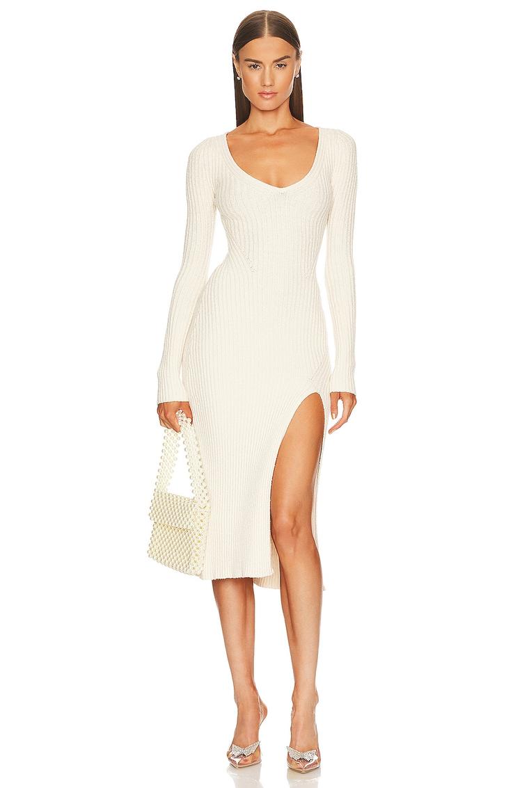 Soft cream knit fabric sculpts a fitted sheath silhouette with a flattering U-neckline and long sleeves for timeless elegance. The midi length combined with a daring side slit adds subtle allure, perfect for cocktail parties, night outs, or romantic date nights. Slip-on ease meets sophisticated style in this minimalist and versatile dress that effortlessly transitions across seasons. Crafted with a cotton-nylon blend enhanced by a touch of spandex, it promises comfort alongside its sleek, body-hugging fit.
