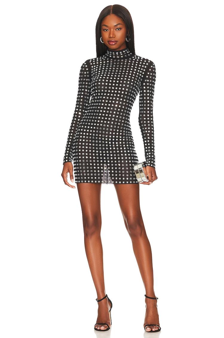 A sleek matte black mini dress adorned with shimmering silver crystal embellishments throughout creates a striking modern silhouette. The fitted shift shape with a chic mock neck and long sleeves balances sexy and sophisticated vibes. Perfectly tailored with an invisible back zipper, this piece offers an elegant clean hemline and stretchy polyester-elastane fabric for comfort. Ideal for autumn and winter nights out, cocktail events, or stylish date nights, it delivers a bold yet refined statement in contemporary eveningwear.
