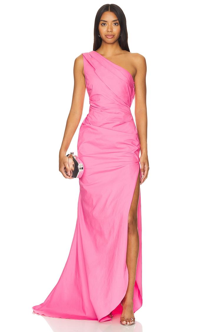 Bright pink poplin with a subtle stretch defines this elegant column gown, featuring a flattering asymmetric neckline and sleeveless design. The fitted silhouette is enhanced by ruched sides and a daring side slit, creating a sophisticated look perfect for cocktail parties, formal galas, and wedding guest occasions. Fully lined for comfort, the concealed side zipper ensures a seamless finish while the maxi length flows gracefully. Ideal for spring and summer events, this gown combines classic style with modern detailing for a standout evening ensemble.