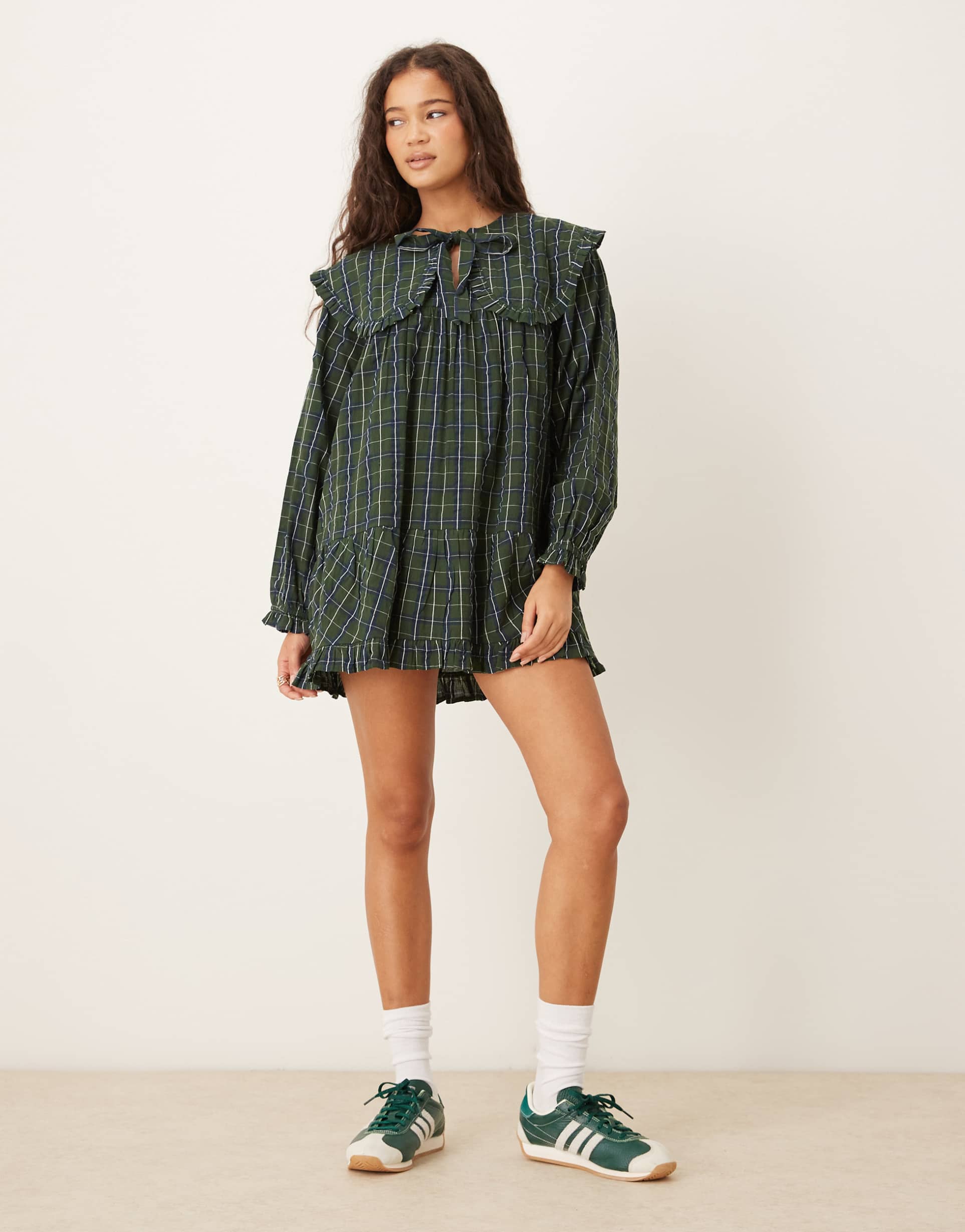 Oversized collar and a tie-front detail enhance this matte blue tartan check shirt dress crafted from breathable cotton fabric. Its mini length and oversized fit offer a relaxed silhouette, complemented by long sleeves and a V-neck collar with playful ruffle trim. Ideal for casual streetwear, everyday outings, or laid-back brunches, this dress blends trendy check patterns with classic shirt dress styling for versatile seasonal wear from spring to autumn.